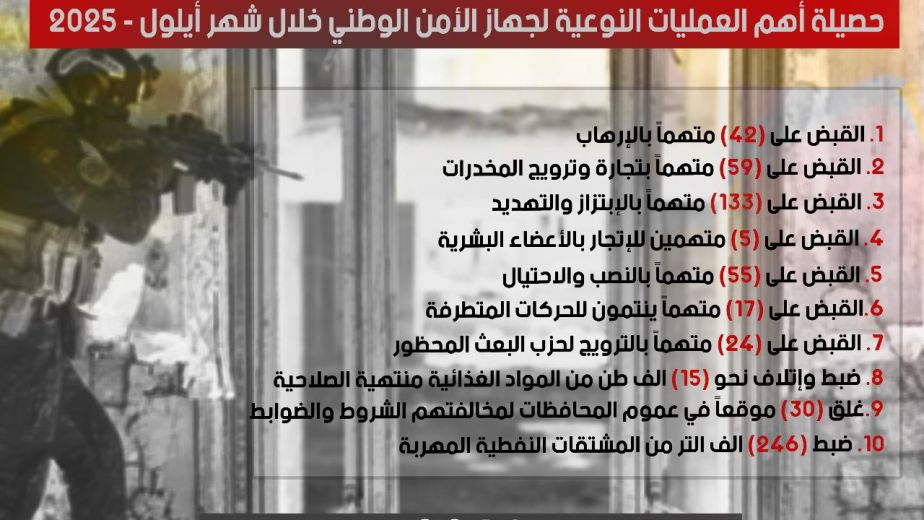 تعكس الإحصائيات المعروضة حجم الجهود الأمنية والاستخبارية التي يبذلها جهاز الأمن الوطني العراقي في أداء مهامه، وتمثل نتائج العمل الميداني خلال فترة زمنية محددة، بما يؤكد التزام الجهاز بحماية الأمن والاستقرار وتعزيز ثقة المواطنين بالمؤسسات الأمنية.
