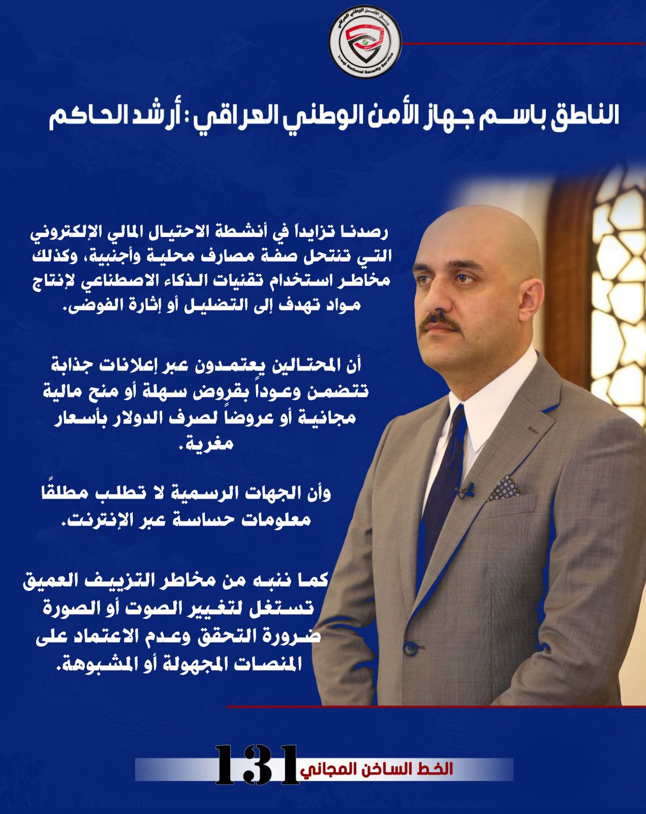 أكد الناطق الرسمي باسم جهاز الأمن الوطني العراقي السيد أرشد الحاكم، أن الجهاز رصد تزايداً في أنشطة الاحتيال المالي الإلكتروني التي تُمارس عبر صفحات ومواقع على وسائل التواصل الاجتماعي تنتحل شخصيات مصارف محلية وأجنبية، وتدّعي تقديم قروض أو فرص استثمارية وهمية بهدف استدراج الضحايا وسرقة أموالهم وبياناتهم المصرفية.